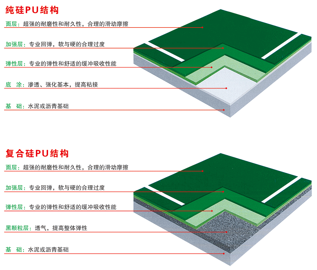 環(huán)保型硅PU系新發(fā)展的環(huán)保球場(chǎng)彈性材料,由德國(guó)引進(jìn)。材料組成為水性有機(jī)硅彈性分散液和水性PL液為基礎(chǔ)樹(shù)脂,配合骨料、填料、色漿、微細(xì)硅纖維及其他添加劑組成。
