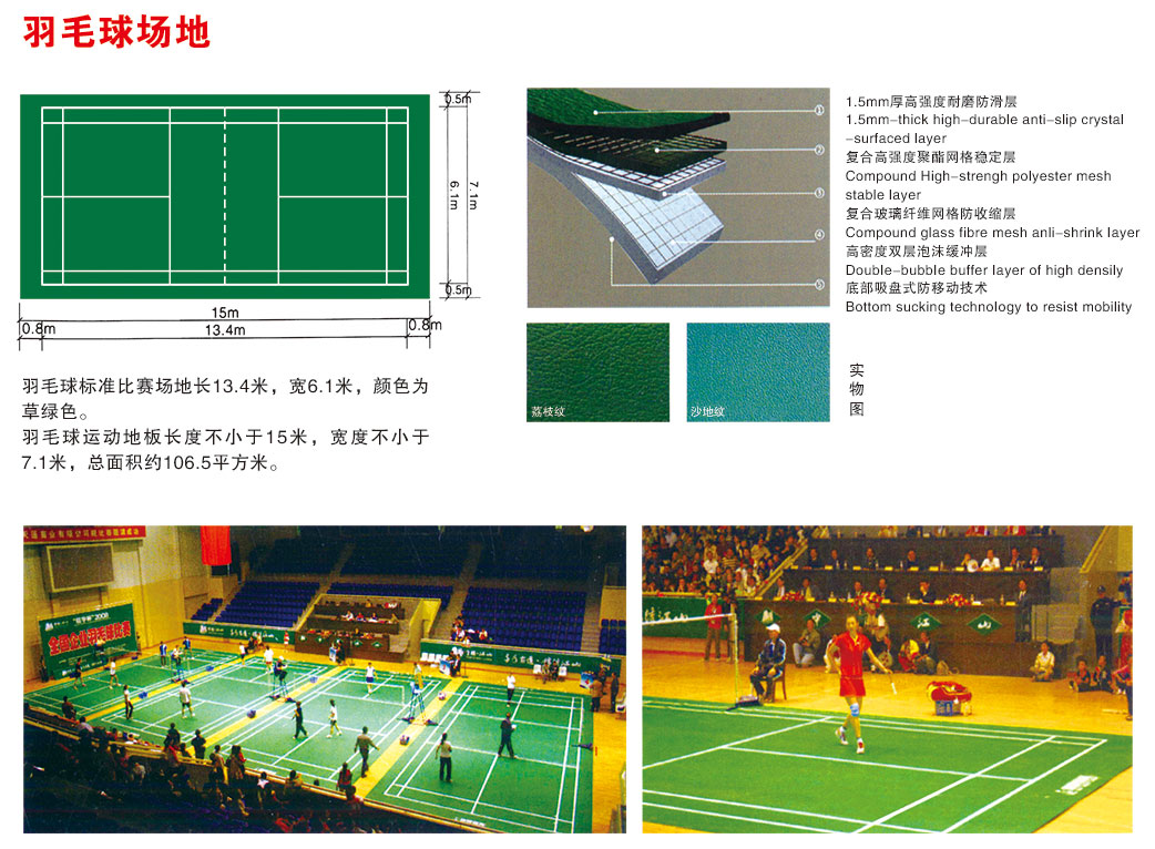 2、在國際比賽中,PVC運動地板是羽毛球、乒乓球、排球、手球指定使用的地板材料。