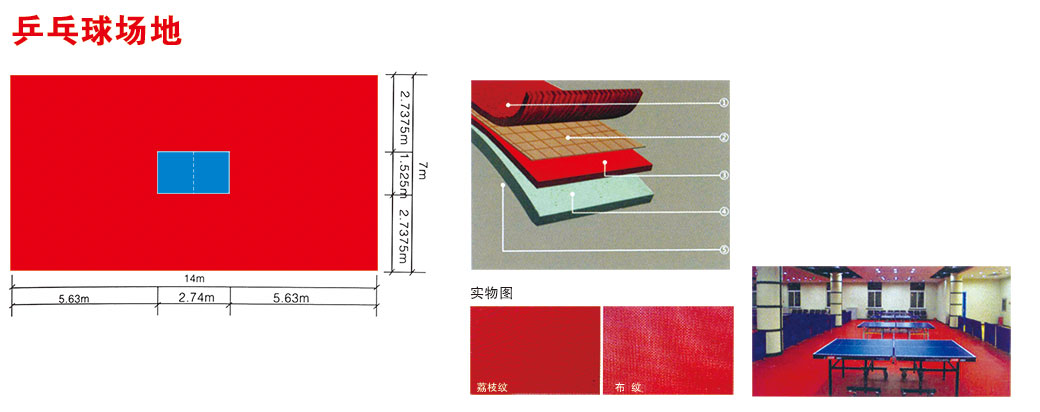 標(biāo)準(zhǔn)乒乓球臺長2.74米,寬1.525米,高0.76米,場地顏色為棗紅色乒乓球運動地板總面積長不小于14米,寬7米以上,總面積約98平方米。